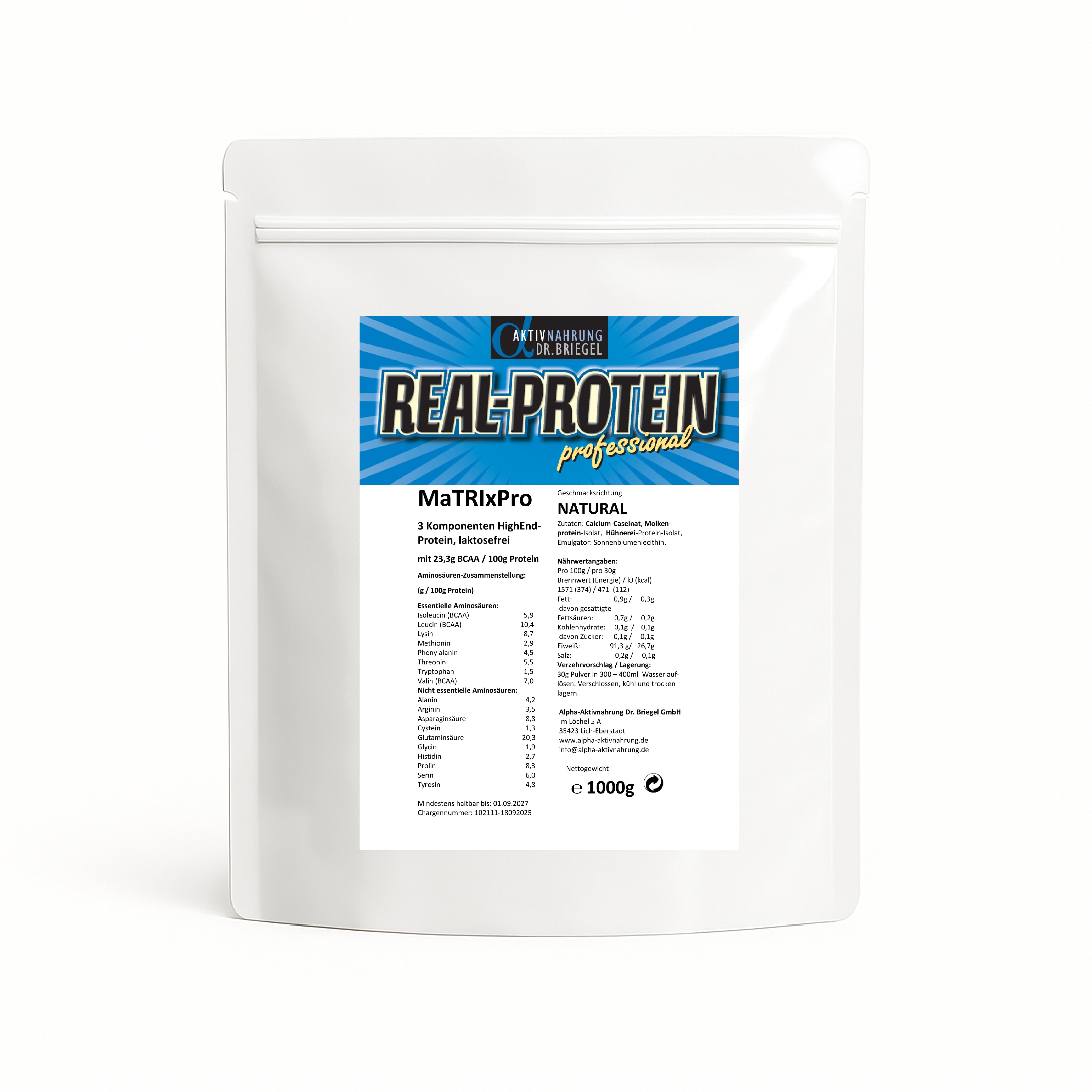 Zutaten: Calcium-Caseinat, Molkenprotein-Isolat, Hühnerei-Protein-Isolat, Emulgator: Sonnenblumenlecithin.